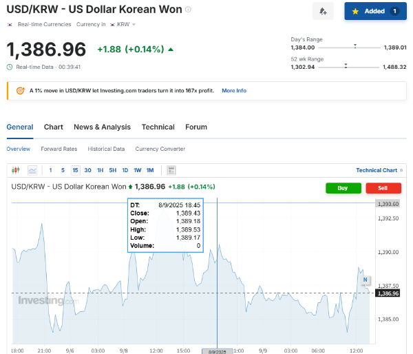 | USD/KRW 환율 | 1,388.7원 | 장중 범위 1,384.5~1,389.2원 |
