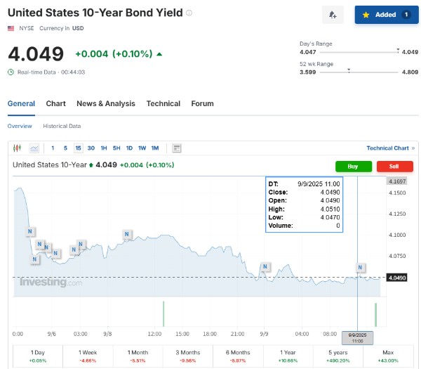 미국 10년물 국채 금리는 최근 4.05% 전후로 내려오며 시장에 완화적 신호를 주고 있습니다. 연방준비제도는 9월 FOMC에서 금리 동결을 유지하겠지만, 인하 기대는 높아진 상황입니다.