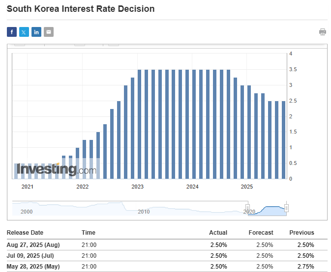 | 한국 기준금리 | 2.50% | 2025년 5월 25bp 인하, 7월 동결 |