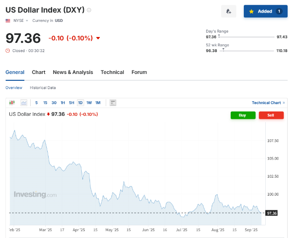 | 달러 인덱스(DXY) | 약 97.4 | 9월 초 저점권, 약세 흐름 |