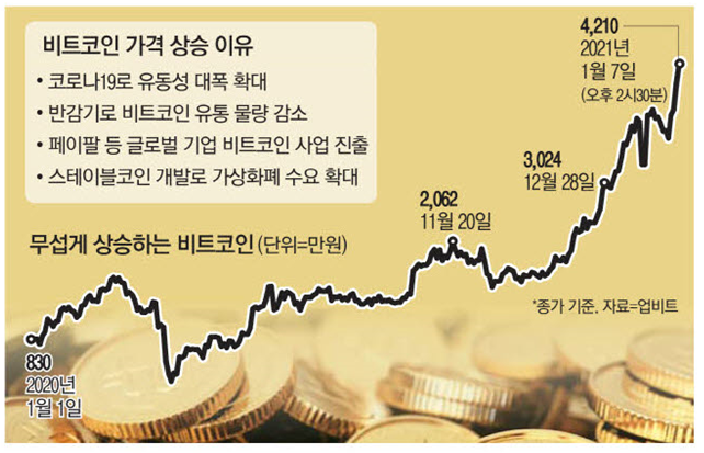 어제 오후 2시 30분 비트코인은 4210만원 선에서 거래됐다. 비트코인 가격은 지난해 12월 27일 처음으로 3000만원 선을 뚫은 뒤 급등을 이어가고 있다. 작년 1월 1일 종가 기준 830만원과 비교하면 약 407% 급등했다.