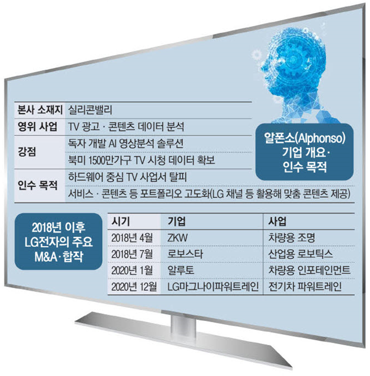 LG전자가 미국 실리콘밸리의 TV 콘텐츠 데이터 분석 전문기업 '알폰소(Alphonso)'를 8000만달러(약870억원)에 인수한다. 지난해 말 캐나다 차량전자장비 기업 마그나인터내셔널과 1조원대 합작 계약을 맺은 지 2주일 만에 단행한 추가 M&A다.