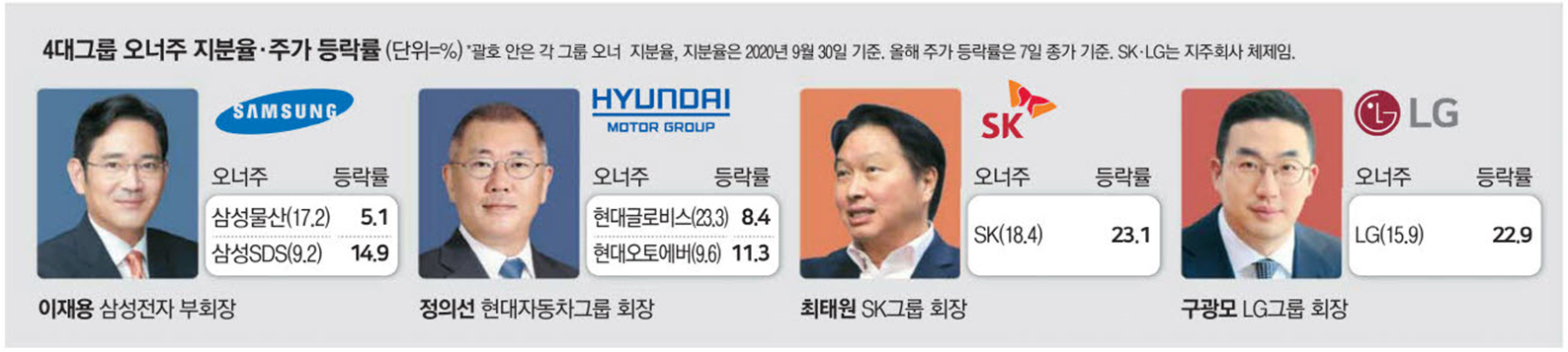 작년 한 해 마이너스 수익률을 기록했던 삼성SDS는 올해 나흘 만에 15% 올랐고, SK와 LG는 23%나 상승했다. 오너주의 올해 수익률이 작년을 넘어선 것은 물론이고 각 그룹 대표주를 웃돌기도 하고 있다.