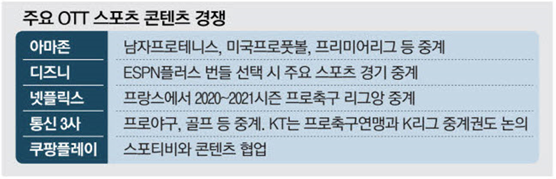 방송사 전유물로 여겨지던 스포츠 중계 시장에도 온라인동영상서비스(OTT) 바람이 불고 있다. 특히 올해 스포츠 채널 ESPN을 보유한 디즈니플러스가 한국 진출을 공식화하면서 OTT 업체들이 경쟁력을 강화하기 위해 스포츠 중계권 확보에 관심을 보이는 모양새다.