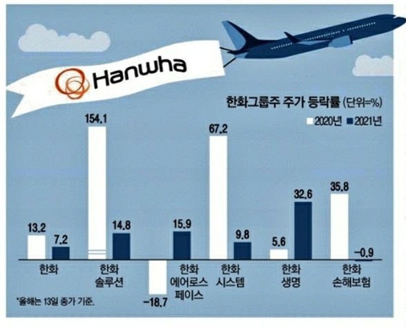 한화 주가는 올 들어 13일까지 7.2% 올랐다. 지난해 전체 상승률이 13.2%였던 것과 비교하면 주가에 탄력이 붙고 있는 것이다. 한화뿐 아니라 한화그룹주가 대체로 양호한 상승률을 보이고 있다.