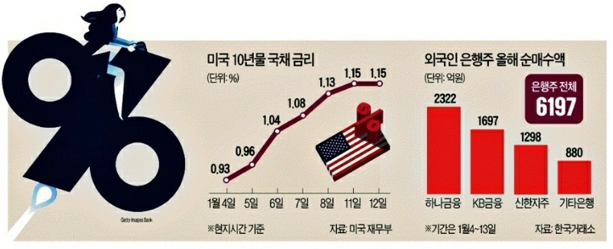 은행주는 매년 1월 하락하는 경향이 있었다. 연말 배당에 대한 기대가 사라진 이후 팔아치우는 투자자가 많기 때문이었지만 올해는 강세를 보이고 있다. 미국 민주당이 백악관과 상·하원을 싹쓸이하는 '블루웨이브'가 현실화하면서 시장금리가 예상보다 빨리 반등하고 있기 때문이다.