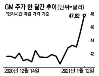 '미국 3대 자동차 제조업체'로 꼽히는 제너럴모터스(GM) 주가가 12일(현지시간) 6.29% 급등해 주당 47.82달러(약 5만2300원)에 거래를 마감했다. GM이 파산 사태를 딛고 2010년 11월 증시에 재상장한 후 기록한 역대 최고 가격이다.