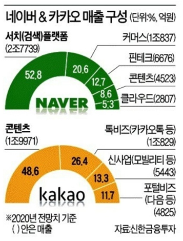 카카오는 콘텐츠(게임·음악) 부문 비중이 48.6%로 가장 많다. 카카오톡 등 톡비즈 사업이 26.4%를 차지한다. 모빌리티·핀테크 등 신사업은 13.3%다.