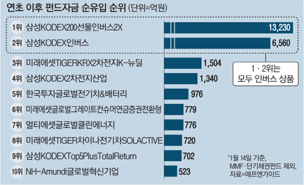 펀드평가사 에프앤가이드에 따르면 연초 이후 14일까지 KODEX200선물인버스2X에는 1조3230억원, KODEX인버스에는 6560억원의 거금이 몰렸다.