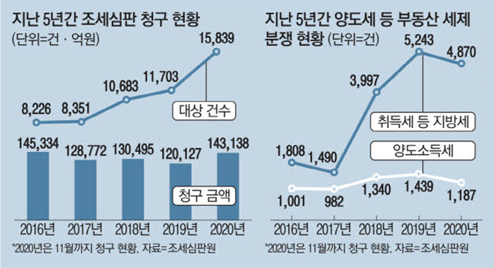또 국민의 세금 부담이 크게 늘면서 과세 처분에 승복하지 못하는 사람도 많아졌다. 특히 '9.13대책' 등을 거치며 1가구 1주택자의 양도세 비과세 요건이 한층 더 강화됐던 2019년에는 양도세 관련 심판이 1439건까지 치솟으며 불복 청구 급증 분위기를 끌어올렸다.