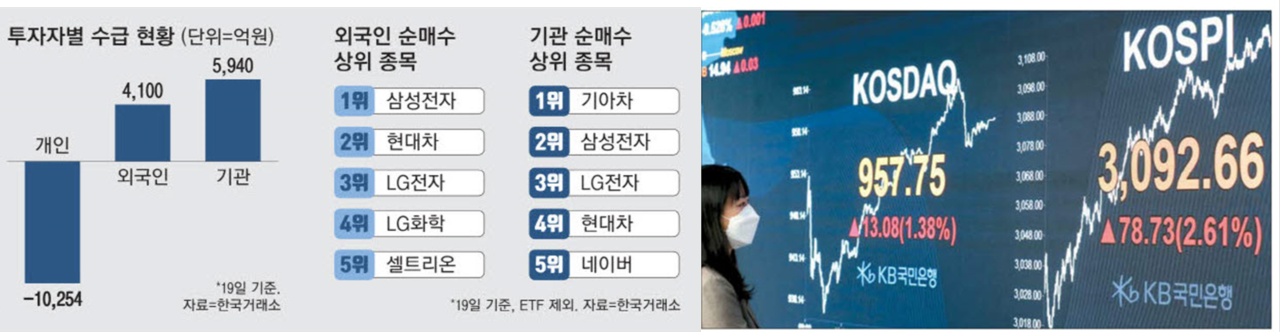 이날 코스피는 전일 대비 2.61% 올라 3092.66을 기록하며 장을 마쳤다. 외국인이 4100억원, 기관이 5940억원 순매수하며 코스피 상승을 견인했다. 외국인은 3거래일, 기관은 8거래일 만의 순매수세다.
