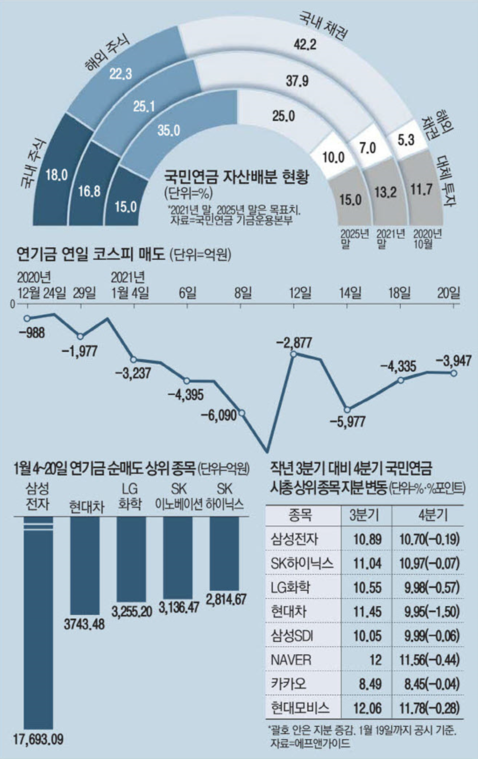 연기금이 계속 대형주를 내다 파는 이유는 지난해 말부터 올해 초까지 코스피가 급등하면서 평가액이 눈덩이처럼 불어났기 때문이다. 지난해 말 기준으로 국민연금은 국내 주식투자 비중 17.3%를 맞춰야 하는데, 10월 말 기준으로 18%까지 상승했다.
