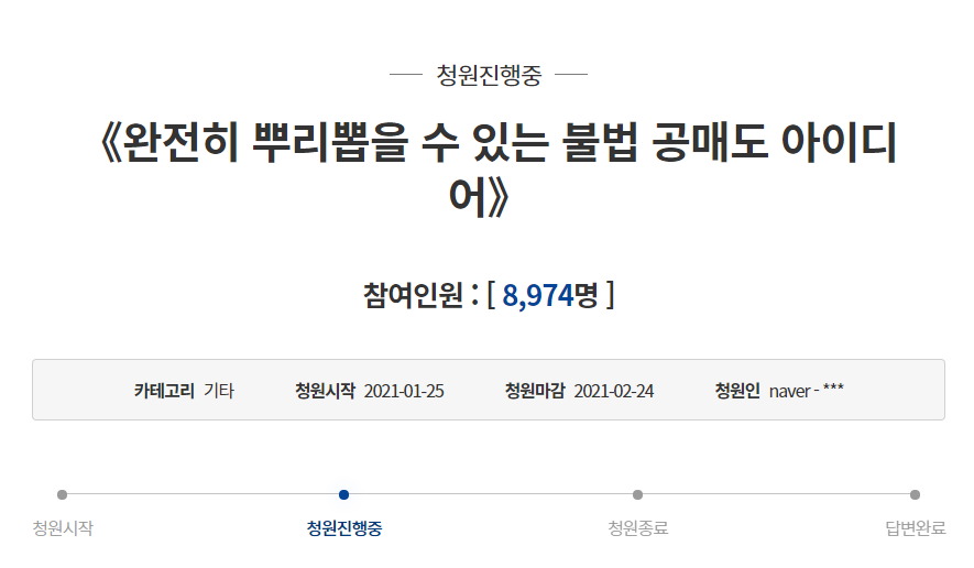 또한 기관과의 경쟁에서 개인도 우위를 점할 수 있다는 것을 보여준 것도 주목할 부분이다. 앞서도 적었지만 개인간 연대가 기관을 무너뜨릴 수 있다는 점을 직접 목도한 것. 아직 현재 진행중이지만. 이에 우리나라에서도 공매도 영구 폐지에 대한 국민 청원이 다시 등장했다. '불법 공매도'에 대한 개선을 요구하는 아래 청원 내용을 확인하시기 바란다.