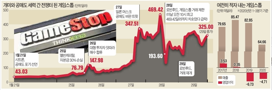 '개미(개인 투자자)들의 반란'으로 화제를 모은 게임스톱 사태는 여전히 현재진행형이다. 게임스톱 주식을 대량 공매도한 일부 헤지펀드가 손을 털고 나오면서 항복을 선언했으나, 대부분의 공