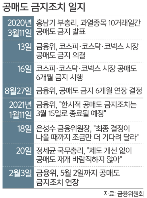 금융위가 공매도 재연장 방침을 어제(2/3) 증시 마감 후 발표했다. 기존 3월 16일 재개로 예정되어있던 공매도 금지 시한을 한 달 반 뒤로 늦춘 것. 다만 공매도 영구 폐지는 없을 것이라 못 박았다. 타 선진국들은 공매도가 재개된 데 반해 우리나라만 여전히 금지 중이니 자본유출이 우려된다는 까닭에서다.