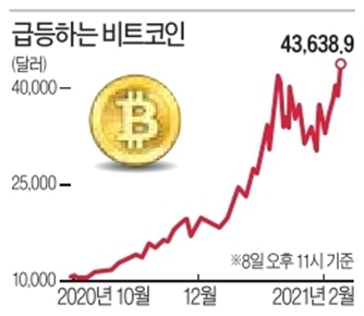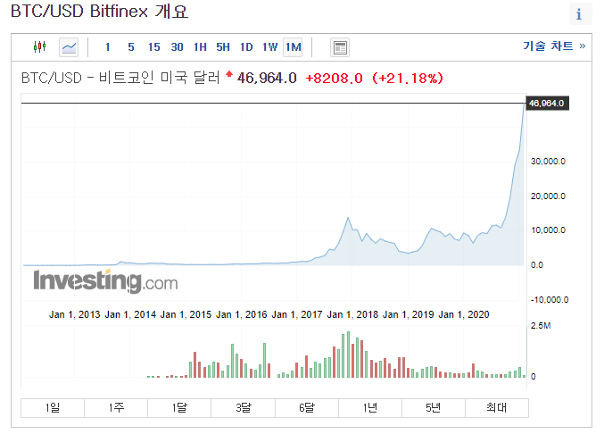 비트코인은 어제 하루에만 12% 폭등하여 오후 11시 기준 43,638.9달러를 기록했다. 오늘(2/9) 오전 9시 기준으로는 46,000달러가 넘는다. 전날 대비 21% 급등한 수준이다. 원달러 환율을 단순 1,100원으로만 계산해도 코인 하나에 5천만원을 상회하는 가격이다.