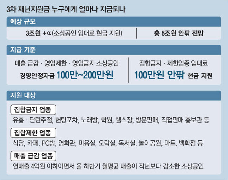 당정청이 12월 27일 국회에서 열린 고위 당정청협의회에서 코로나19 3차 재난지원금을 최대 300만원까지 지급할 예정. 매출 급감 및 영업 제한·금지 조치를 받은 소상공인에 대해 경영안정자금(100만~200만원)을 지급하고, 임대료 명목으로 100만원 안팎을 추가 지급하기로 결정