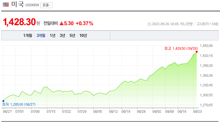 이 글 쓰고 있는 동안에도 계속 오르는 중. 조금 전 캡처했을 때 1425원이었는데 지금은 1428원까지 더 올랐다. 수출 산업이 주요 경제 기반인 우리나라에 호재 아니냐는 시각이 있을 수 있겠으나, 수입 물가 상승으로 똔똔이라 볼 수 있겠다. 일단 한미 금리 역전으로 해외 자본유출이 심각하게 우려되는 상황이라는 게 더 큰 문제다.