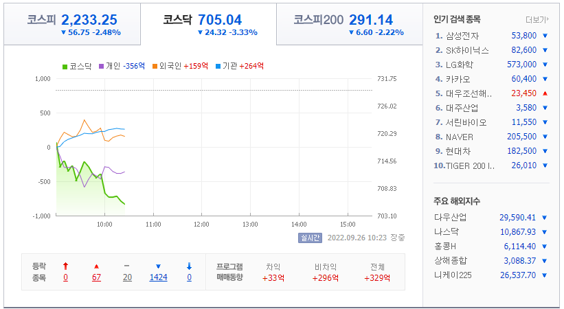 예견되었던 블랙먼데이가 실현되는 중, 9월 26일 10시 23분 기준으로 코스피는 -2.48%, 코스닥은 무려 -3.33% 빠졌다. 지난 금요일(9/24)에 코스피 2300선 무너졌다고 난리였는데 불과 1 거래일 만에 2200선도 위협받고 있다. 코스닥도 700선이 위태로운 상황이다.