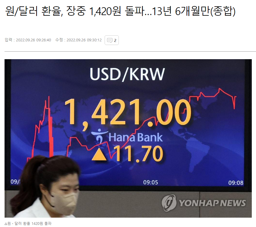26일 원/달러 환율이 약 13년 6개월 만에 처음으로 1,420원을 돌파했다. 서울 외환시장에서 달러 대비 원화 환율은 이날 오전 9시 개장 직후 수 초만에 1,421.0원까지 올랐다. 환율이 장중 1,420원을 넘