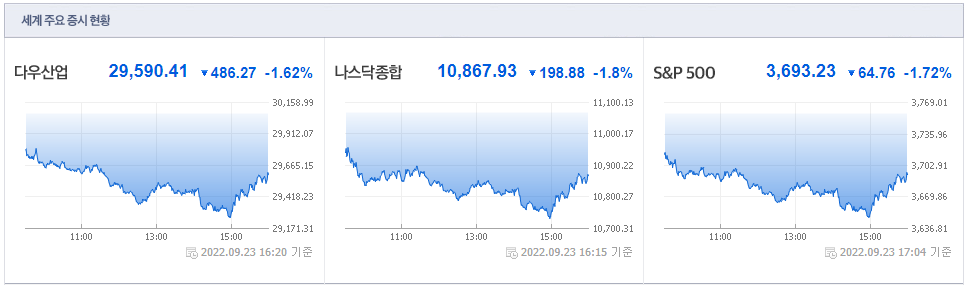 지난 9월 24일 새벽(우리나라 기준) 미국 증시가 또 한차례 폭락했다. 다우지수가 29,590.31로 -1.62% 하락 마감, 나스닥은 10,867.93로 -1.8%, S&P 500은 3,693.23으로 -1.72% 하락했다. 다우지수는 3만 선이 무너지며 2020년 이후 최저치 기록, 나스닥과 S&P 500은 지난 6월 16일(미국 기준) 각 전저점인 10,646.10, 3,666.70에 다시금 근접한 모습이다.