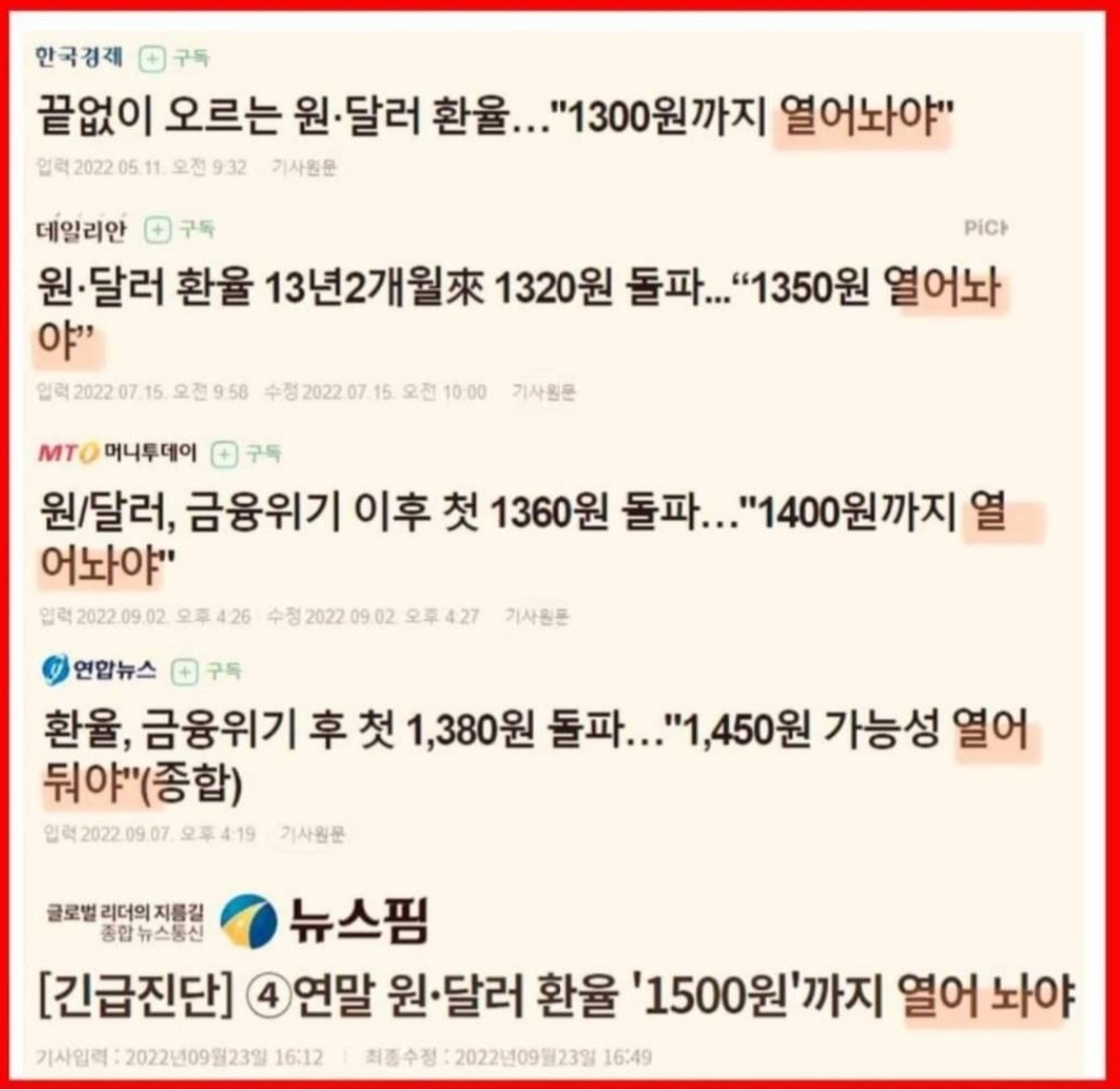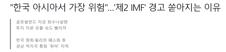 그럼에도 당장 환투기 세력들이 일본과 중국은 못 건드리니 만만한 우리나라에 와서 원화 가치가 상대적으로 더 약화된다는 분석도 있다. 이러니 위와 같은 매운맛 헤드라인도 쏟아져 나오는 것. 인구절벽, 더 이상 성장동력을 잃어버린 나라, 전 세계에서 가장 빨리 소멸 중인 나라 대한민국. 환율은 신호탄인가? 진짜 제2의 IMF 금융위기 오나?