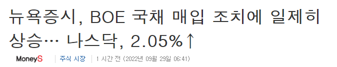 애플은 아이폰 14 생산량을 감축한다는 소식에 애플 너마저.. 본격 경기 침체 - 기업 실적 악화 우려에 하락했고, 대부분의 종목들은 매크로 호재에 상승했다. 금리가 한달에 막 0.75bp씩 오르는데 주가 상승이라니? 이제 찐바닥 다 왔나? 기대감이 생길 법한데.. 실상은 좀 다르다. 영국의 중앙은행인 영란은행(BOE)이 적극적인 시장 개입으로 국채 금리를 강제로 누른 것이다.