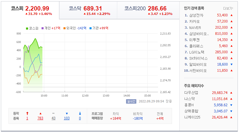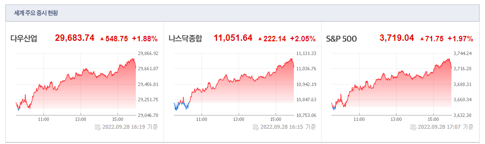 그 결에 국내 증시도 간만에 탄력을 받고 있다. 아직 개장한지 1시간도 안 되긴 했지만. 근데 이게 과연 찐반일 리가? 최근 영국의 감세 발표도 그렇고 IMF의 경고도 그렇고 영국의 분위기가 심상치 않다. 다른 나라 걱정할 때는 아니지만.