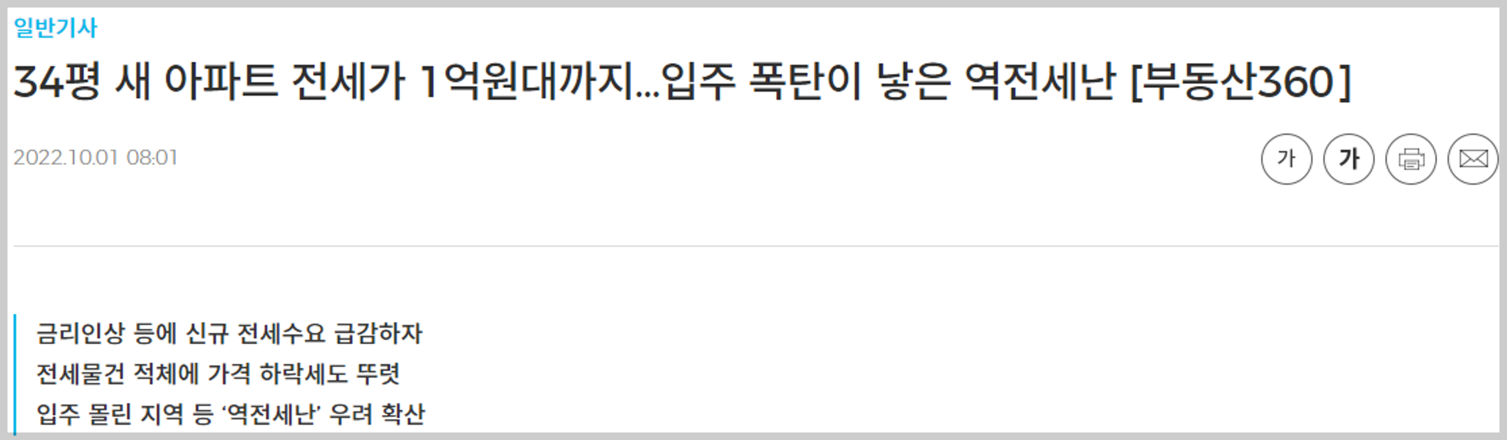 바야흐로 부동산 시장 침체기, 그를 넘어 폭락기의 신호탄인가. 국민평형인 34평(전용 84㎡) 신축 아파트 전세 호가가 1억원대 후반에 나왔다. 경기 양주시의 한 공인중개사무소 관계자에 따르면, 하반기 입주 예정 물량이 많아 전세물건이 쏟아지면서 전세가도 약세를 면치 못하고 있다.