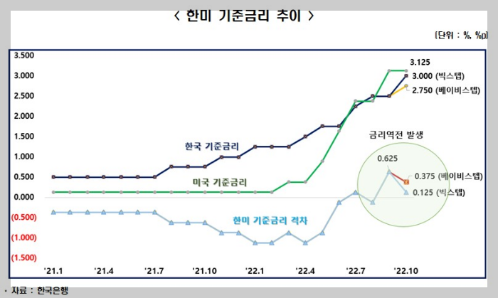 미국 연준발 금리인상 쓰나미가 세계 곳곳을 덮치고 있는 가운데, 동아시아 국가들 중 상대적으로 경제 체력이 약한 우리나라가 그 직격탄을 맞고 있는 모양새다. 역전된 미국과의 금리차가 갈수록 더 벌어질 거라 예상되는 가운데, 가계부채 폭탄 뇌관이 터질까 마음껏 기준금리 인상도 어려운 상황. 그야말로 사면초가다.