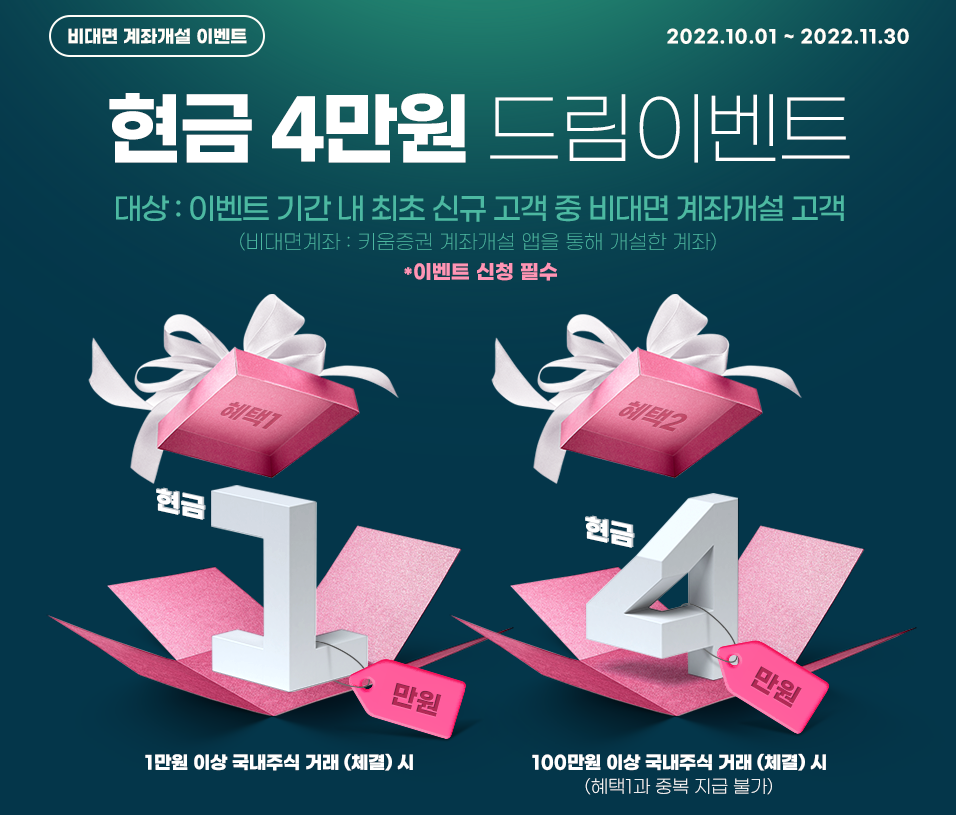 ✔️ 계좌개설 이벤트: 현금 4만원 지급(100만원 이상 거래 시, ~2022.11.30.)
