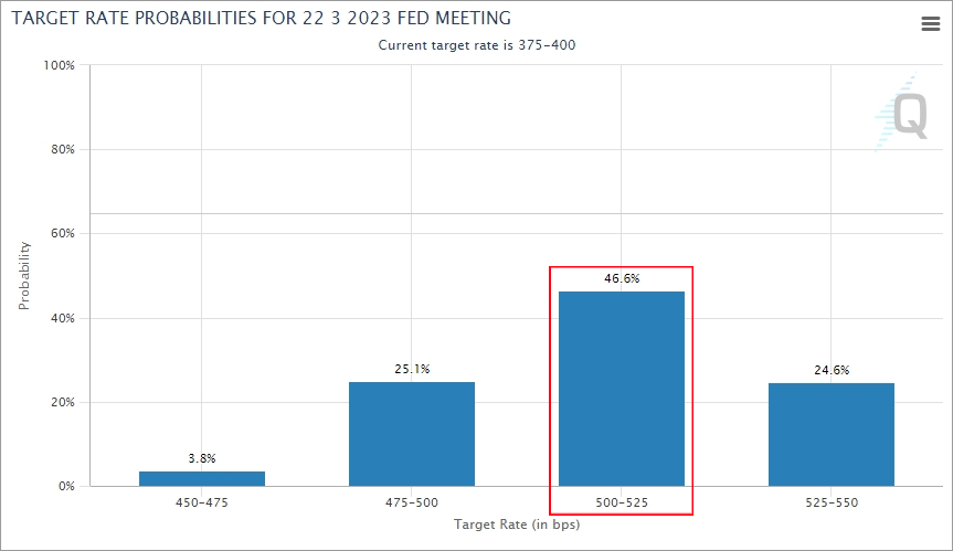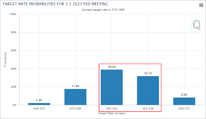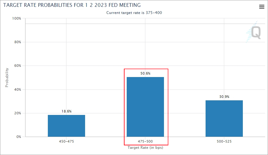 여기까지는 다들 예상하는 바라 치더라도, 2023년에도 금리인상 기조가 계속 이어질 거라는 전망이 중론이 되어간다는 것이 더 큰 문제로 대두되고 있다. 미국 기준금리 인상 전망치를 제공하는 CME Group의 FedWatch에 따르면 2023년 2월과 3월에도 계속 금리를 올려 결국 5%대까지 올릴 거라는 예상이 주를 이루고 있다.