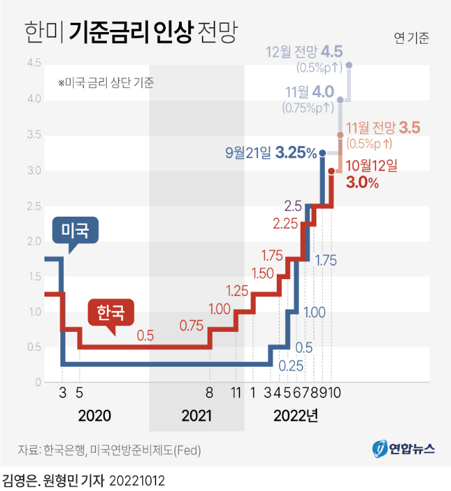 미국 기준금리 지속 인상이 한국은행 금리인상에 영향이 없을 리 없다. 11월 24일 한은 금통위 일정에서 0.5%p를 올려도 연말 한미 금리차는 1%로 벌어질 것으로 전망된다.(한국 3.5% vs 미국 4.5%)