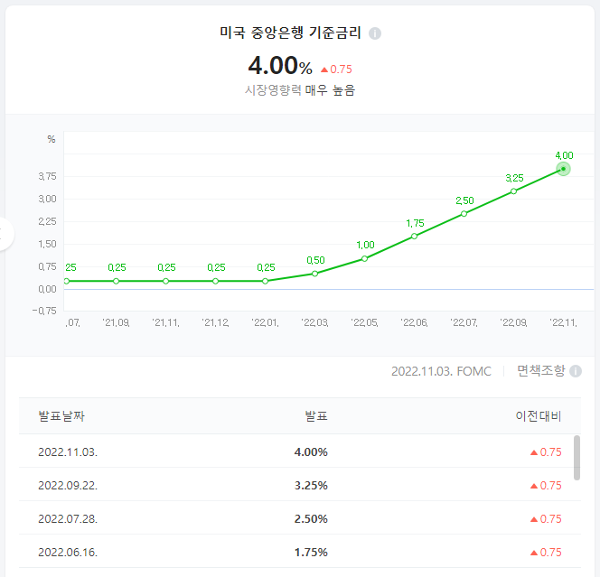 미국 기준금리 4%대 시대가 다시 도래했다. 지난 11월 3일 목요일 새벽 3시경(우리나라 기준) 미 연준 FOMC에서 네 차례 연속으로 자이언트 스텝(0.75%p) 인상을 확정지으며 미 기준금리는 4% (3.75% ~ 4%)로 인상되었다. 2008년 글로벌 금융위기발 양적 완화 및 본격 저금리 기조가 벌어지기 전으로 회귀한 것이다.