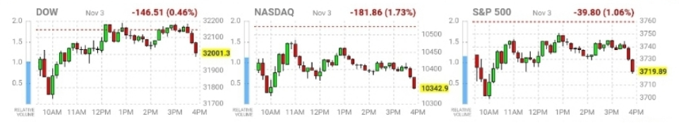 사실상 미 연준의 이번 0.75%p 자이언트스텝 금리인상은 주식시장에 이미 선반영되었다는 게 중론이었다. 11월 8일 미국 중간선거 일정과, 경기침체 우려에 따른 연준 속도조절론이 최근 반등의 불씨를 지피고 있었지만, 제롬 파월 연준 의장의 인터뷰가 이어진 11월 3일 목요일 3시 반 무렵(우리나라 기준), 주식시장은 다시한번 하방으로 방향을 틀었다.