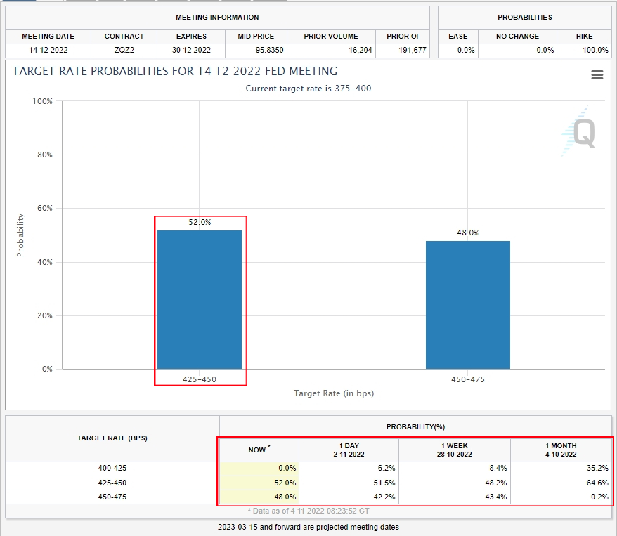 2022년 말 최종 미국 기준금리는 4.5% (4.25% ~ 4.5%)로 예상된다. 올해 한 차례 더 남은 12월 4일 연준 FOMC 일정에서의 미 금리인상 예상치는 0.5%p가 유력하다. 하지만 파월의 매파적(hawkish) 발언 이후 자이언트 스텝(0.75%p) 인상 기대치 또한 한 달 전에 비해 많이 올라와 빅스텝과 자이언트 스텝 예상은 근소한 차이로 좁혀졌다. (52% vs 48%)