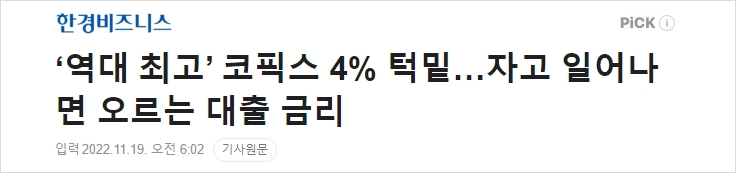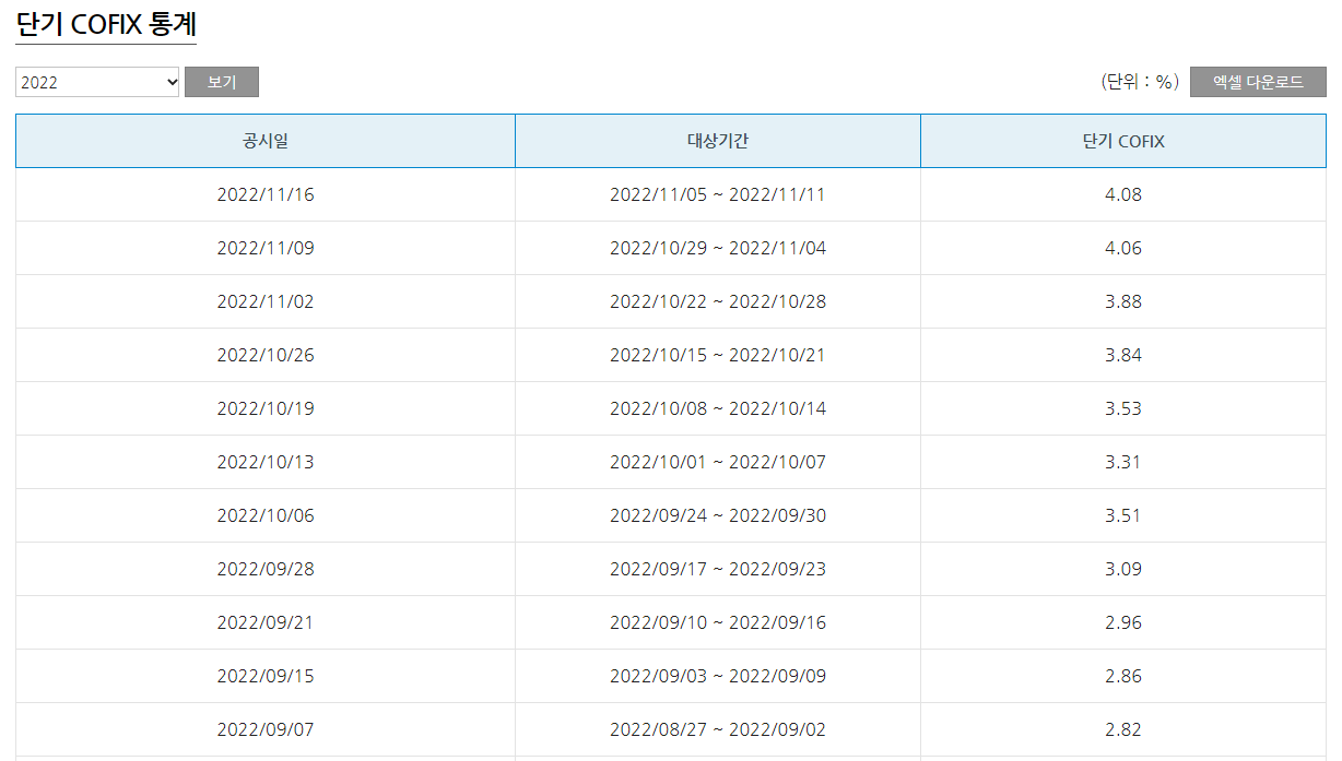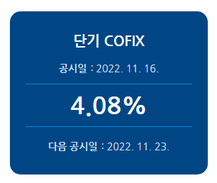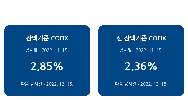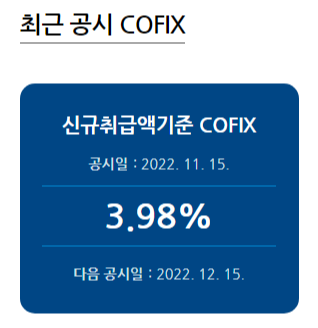 최근 공시 코픽스 금리 현황은 위와 같다. 신규취급액기준 COFIX는 2022년 11월 15일 3.98%로 공시되어 개시일(2010년 7월 16일) 이래로 최대치를 기록했다. 신규취급액기준, 잔액기준, 신잔액기준 COFIX는 매월 15일(공휴일인 경우 다음 영업일) 15시에 이전달을 대상월로 하여 공시된다. 2022년 코픽스는 아래와 같이 우상향을 그리고 있다.