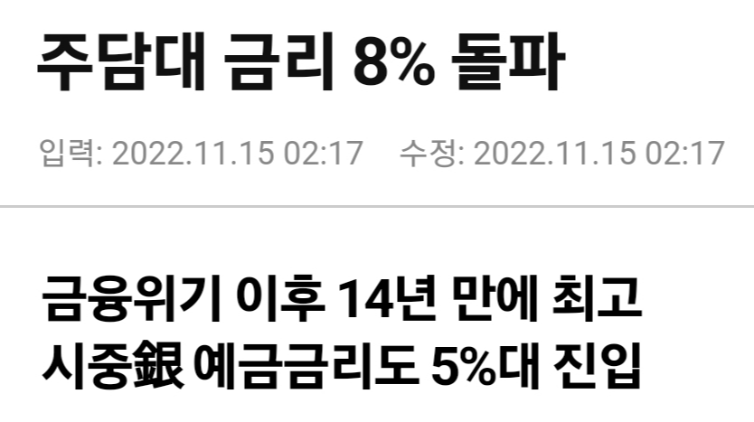 그에 따라 결국 주담대 금리 상단이 8%를 돌파했다. 위 기사에 따르면 실질적으로 8% 금리를 적용받는 차주는 거의 없다지만, 상징적으로 의미가 깊은 수치다. 높은 수준의 금리 추세가 계속 이어질 거라는 전망이 곧 향후 부동산 시장 전망 아니겠나. 이르면 올 연말, 늦어도 내년 상반기 중에는 두 자릿수 주담대 금리를 보게 될지도 모를 일이다.