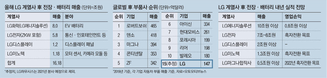 100대 글로벌 자동차 부품사 매출액과 비교하면 LG 계열사들의 전장·배터리 사업은 15위에 해당한다. 각 계열사의 내년 자동차부품 실적 목표가 현실화되면 매출 20조원 이상의 글로벌 10위 내 부품사로 도약한다. 특히 24일 마그나와 1조원대 합작사(JV) 설립계약을 맺어 차세대 EV 파워트레인을 개발하면서 LG는 미래차 파워트레인까지 선점하게 됐다.