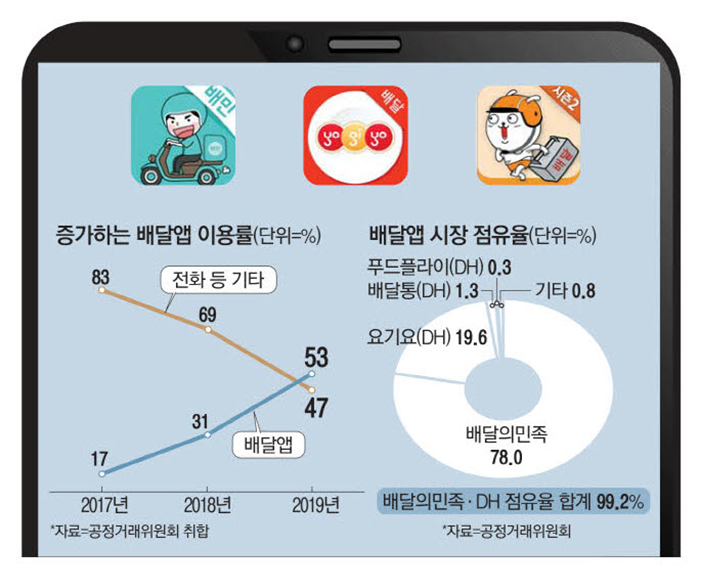 공정위가 '요기요 매각'이라는 강력한 조건을 내건 이유는 배민(점유율 78%)과 요기요의 결합이 할인 혜택 축소, 음식점 수수료 인상 등으로 이어질 수 있다고 봤기 때문. 두 회사 결합이 압도적 독과점에 해당한다고 판단했다(배달 앱 시장 점유율 합계가 직전 연도 거래금액 기준 99.2% 수준).
