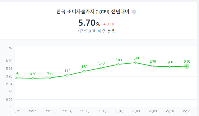 마지막으로 2023년 기준금리 전망에 대해 알아보자. 먼저 물가를 봐야 할텐데, 전년대비 한국 소비자물가지수(CPI)가 꺾이며 인플레이션은 정점을 지났다는 게 중론이다. 지난 8월 2일 우리나라 CPI는 6.3%를 기록하며 정점을 찍은 뒤, 9, 10, 11월 모두 5%대를 기록하고 있다. 여전히 5% 후반대로 인플레이션이 잠잠해졌다 보기엔 어려운 고물가 수준이긴 하다.