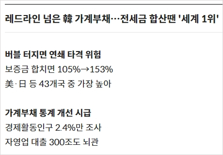 가계에 영세 자영업자를 더하고, 여기에 전세보증금까지 합치면 지난해 총 가계부채는 3187조5000억원에 달한다. 이 경우 한국의 GDP 대비 가계부채 비중은 105.8%가 아니라 153.9%로 단번에 48.1%포인트 급증해 조사 대상 43개국 가운데 1위로 뛰어오른다.