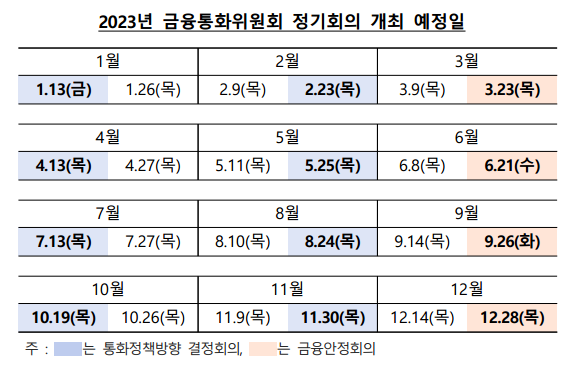 한국은행은 10월 28일 보도자료를 통해 2023년 금통위 일정을 공개했다. 2023년 금융통화위원회 정기회의는 총 24회 개최될 예정이고, 이 가운데 통화정책방향 결정회의는 8회(1, 2, 4, 5, 7, 8, 10, 11월), 금융안정회의는 4회(3, 6, 9, 12월)다. 통화정책방향 결정회의가 열리는 날이 한국은행 기준금리 발표일이 된다.