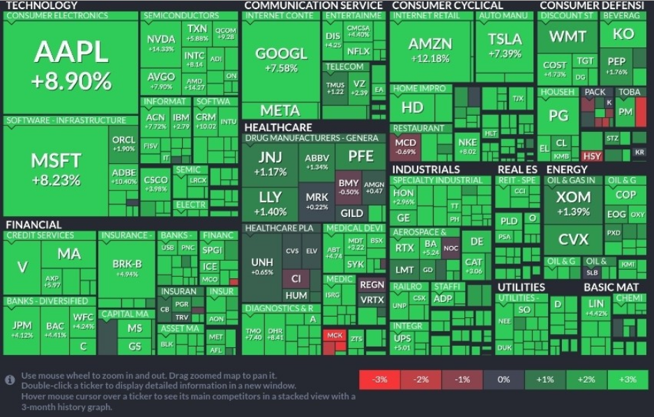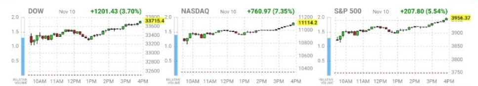 CPI 지수와 Core CPI 모두 예상치를 하회하며 의미있는 인플레이션 감소라 시장에서 받아들인 듯하다. 발표 당일 다우 지수는 3.7%, 나스닥 7.35%, S&P 500은 5.54% 급등하며 주식시장이 환호한 바 있다.
