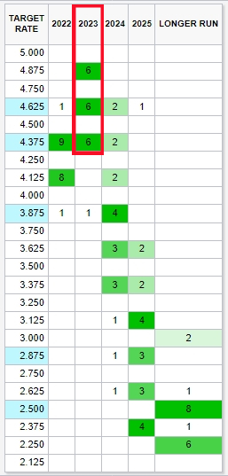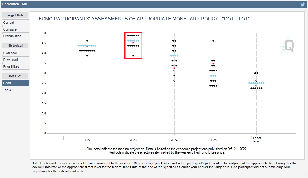 점 도표는 FOMC에 참여하는 Fed 위원들이 제공하는 기준금리 예상치다. 왼쪽의 차트와 오른쪽의 표 두 가지 형태로 제공되는데, 2023년 기준금리 상한 5%, 4,75%, 4,5%에 골고루 6표씩을 준 모습을 볼 수 있다. 왼쪽 차트에 빨간 점으로 찍힌 평균치 4.6% 정도가 2023년 최종금리 수준이라 예상되어 왔다.
