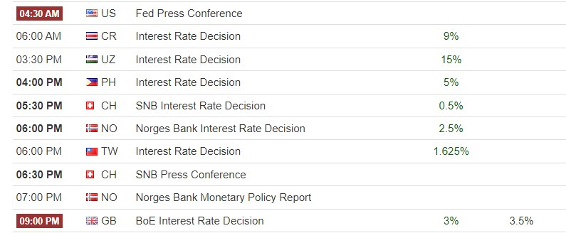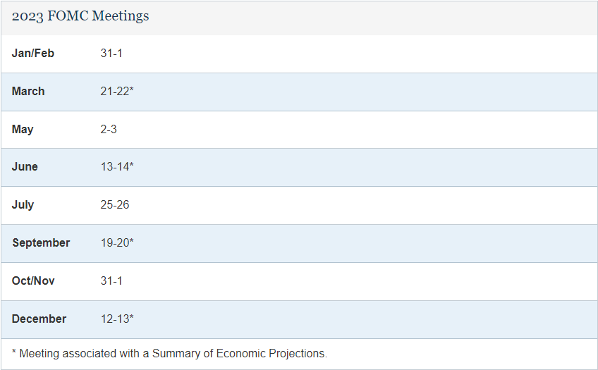 공교롭게도 같은 날(우리나라 기준 12월 15일), Fed뿐 아니라 유럽중앙은행(ECB), 영국 중앙은행(BOE)도 금리 인상을 발표한다. 스위스, 노르웨이, 대만, 사우디아라비아, 필리핀 등 10여 개국의 중앙은행들도 같은 날 기준금리를 결정하게 된다. 2023년 FOMC 일정은 아래 표와 같다.
