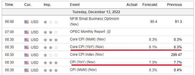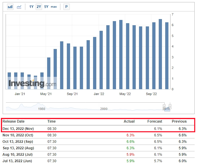 매월 발표되는 미국의 CPI 소비자물가지수(전년 대비 YoY, 전월 대비 MoM)는 자국의 인플레이션 정도를 파악하는 척도로 쓰인다. 11월 CPI는 현지 기준 12월 13일(화) 08:30 (국내 시각 같은 날 22:30)에 발표 예정인데, 일반 소비자물가지수 CPI와, CPI 지수에서 변동이 심한 식품과 에너지 물가를 제외한 근원소비자물가지수(Core CPI)로 구분된다.