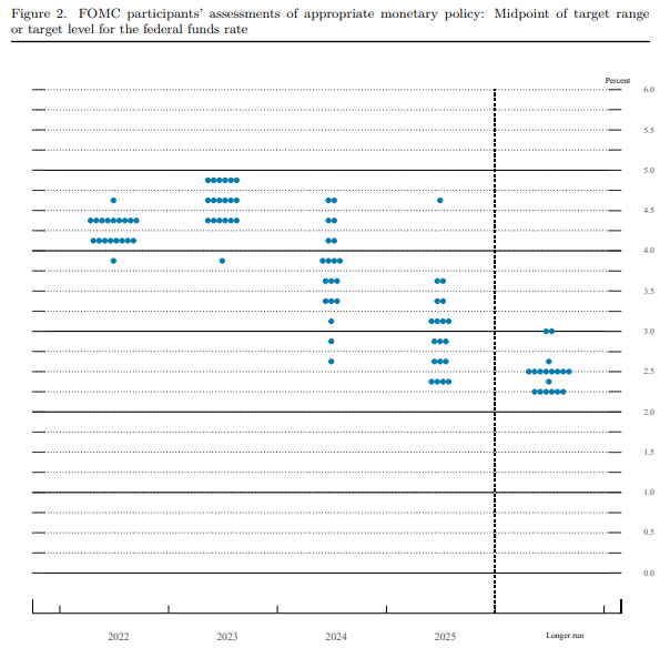 점 도표는 FOMC에 참여하는 Fed 위원들이 제공하는 기준금리 예상치다. 왼쪽의 차트와 오른쪽의 표 두 가지 형태로 제공되는데, 2023년 기준금리 상한 5%, 4,75%, 4,5%에 골고루 6표씩을 준 모습을 볼 수 있다. 왼쪽 차트에 빨간 점으로 찍힌 평균치 4.6% 정도가 2023년 최종금리 수준이라 예상되어 왔다.