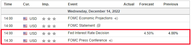 2022년의 마지막 미국 금리인상 시기가 될 연방준비제도이사회(FOMC) 일정이 CPI 지수 발표 일정에 이어진다. 현지 시간 기준 12월 13일~14일에 열리고, 12월 14일(수) 14:00 (우리나라 기준 12/15(목) 04:00)에 금리 인상이 결정된다.