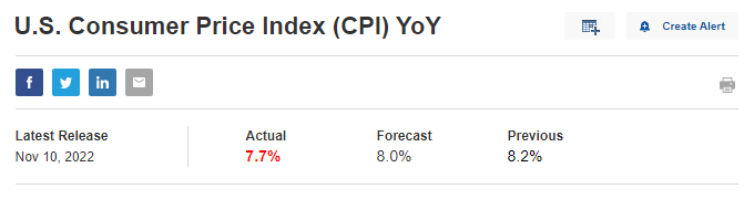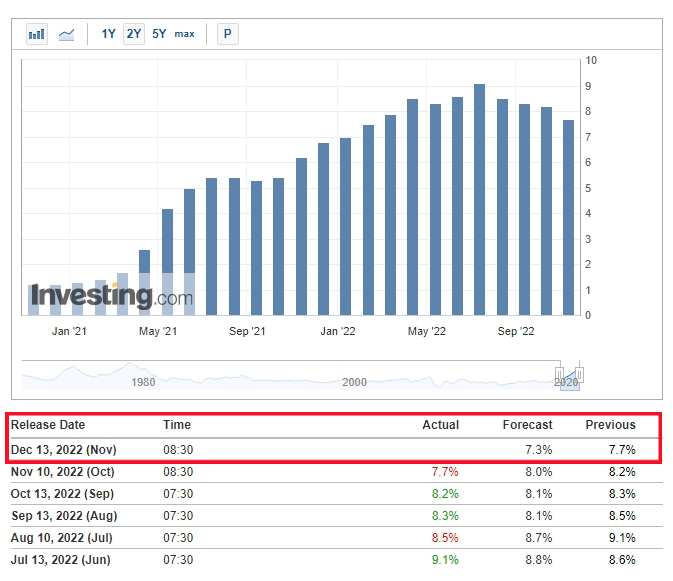 참고로 지난 11월 10일에 발표되었던 10월 CPI 지수(YoY)는 예상치 8.0%에 실제 7.7%, Core CPI(YoY)는 예측치 6.5%에 실제 6.3%로 발표되어 서프라이즈를 기록했다.
